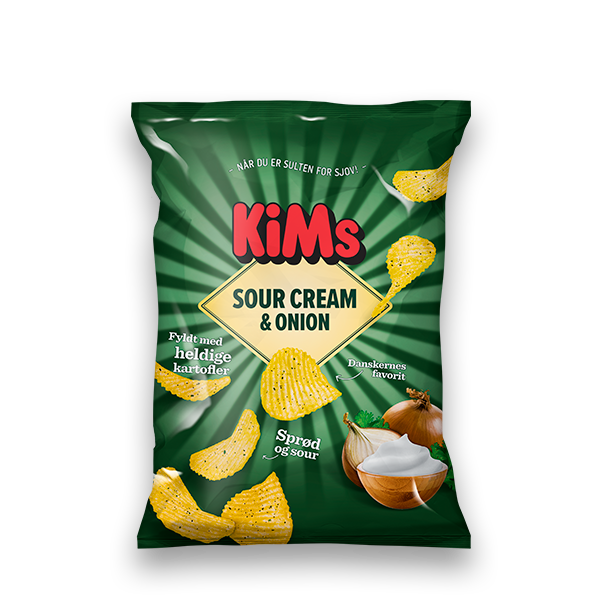 KiMs Sour Cream & Onion 160g er kartoffelchips krydderi, og har været danskernes favorit siden 1995!